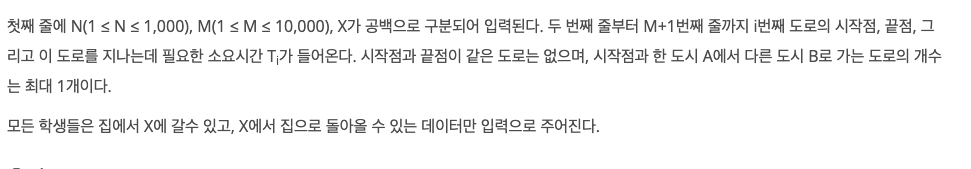 어느 날 이 N명의 학생이 X (1 ≤ X ≤ N)번 마을에 모여서 파티를 벌이기로 했다. 이 마을 사이에는 총 M개의 단방향 도로들이 있고 i번째 길을 지나는데 Ti(1 ≤ Ti ≤ 100)의 시간을 소비한다.