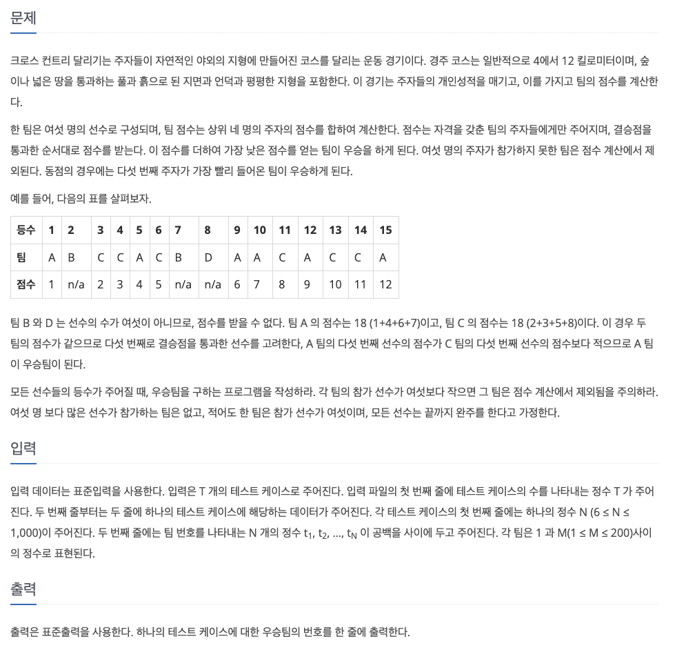 2. 팀 점수는 상위 네 명의 주자의 점수를 합하여 계산한다.
