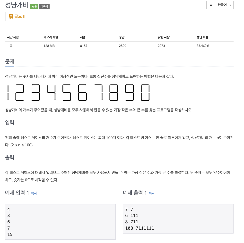 dp[n] = min(dp[n], dp[n-(성냥개비 가능 갯수)] * 10 + 초기 성냥개비 숫자[성냥개비 가능갯수]) 가 된다.